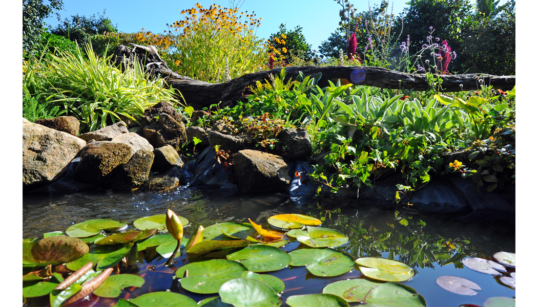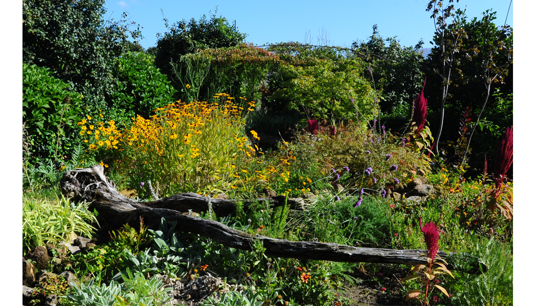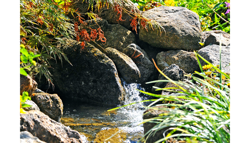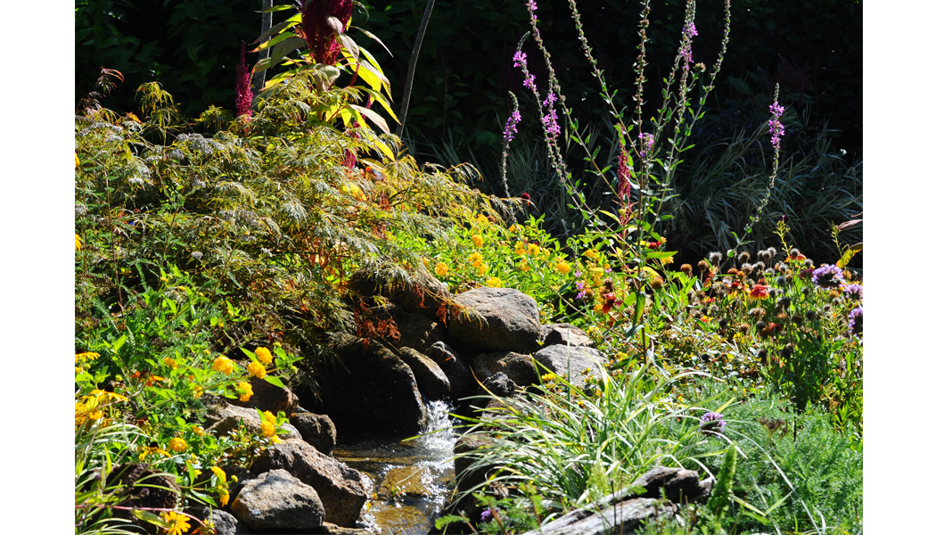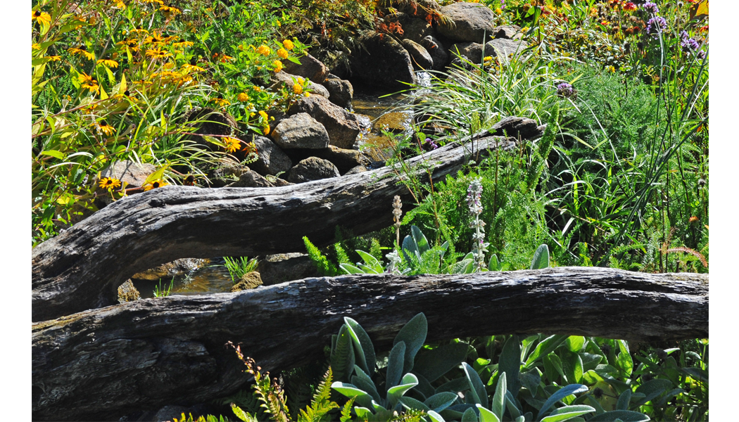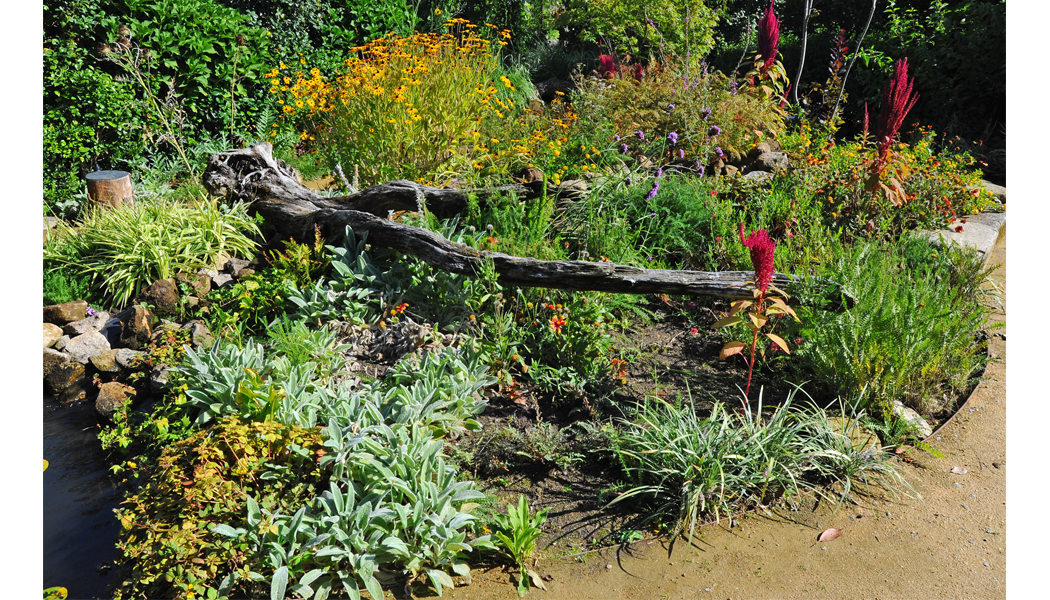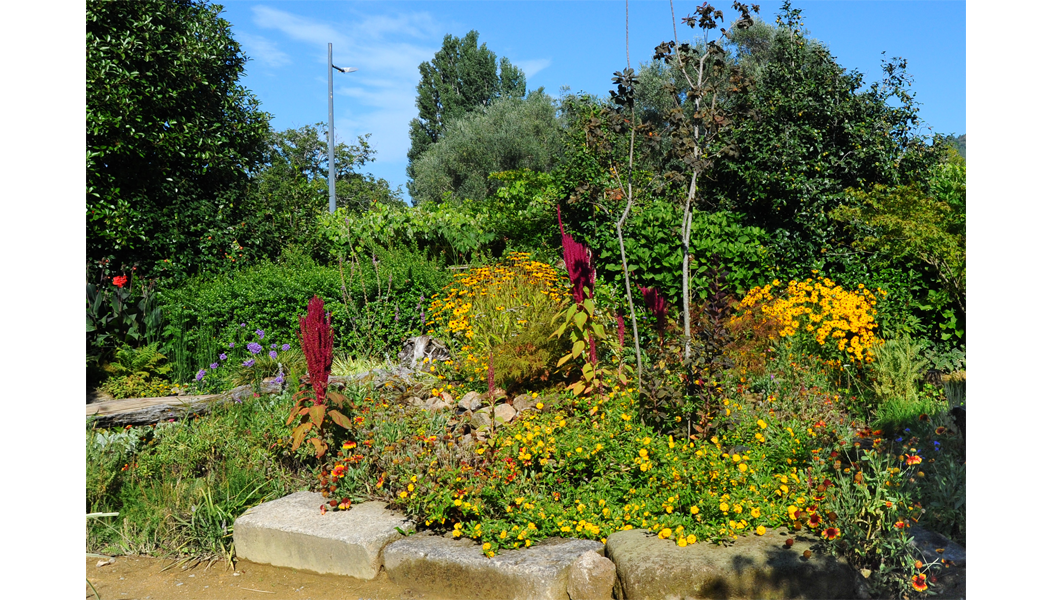 Os numerosos canteiros, compostos por diversas espécies vegetais, estão estruturados de forma a obter um efeito de “cobertura do solo”, assemelhando-se à vegetação primária, não pisada pelo Homem. A aplicação aleatória de pedras e lascas de madeira realça a transformação natural do jardim, pelos elementos do vento e da água. A presença marcante da água no nosso jardim, em diferentes aspetos, como o murmúrio do ribeiro ou o borbulhar da pequena cascata, provoca sons rítmicos que se dissipam gradualmente e acalmam o visitante. A pérgula constitui o abrigo sob o qual, e pelo qual, o visitante é protegido da violência do mundo exterior. Oferece um bom lugar para observar mais de perto e absorver a atmosfera geral. A escultura do cepo de árvore subtilmente humanizado, elemento central do nosso jardim, é o símbolo desta Paz. Uma funde-se com a outra e vice-versa: os dois são um só e constituem uma harmonia infalível. Este elemento central do nosso jardim é, em última análise, a descrição do tema e da nossa visão. Os humanos encontram-se envolvidos na natureza e mantêm com ela uma relação de confiança.