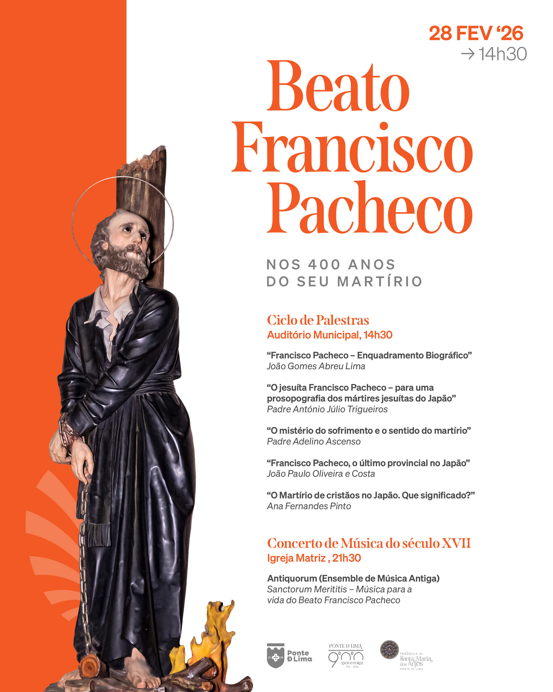 No âmbito das celebrações dos 900 Anos da Fundação de Ponte de Lima, e assinalando também o início das comemorações dos 400 Anos do Martírio do Beato Francisco Pacheco (1565-1626), o Município de Ponte de Lima promove, no próximo dia 28 de fevereiro, a partir das 14h30, um Ciclo de Palestras consagrado à vida e obra deste notável missionário.