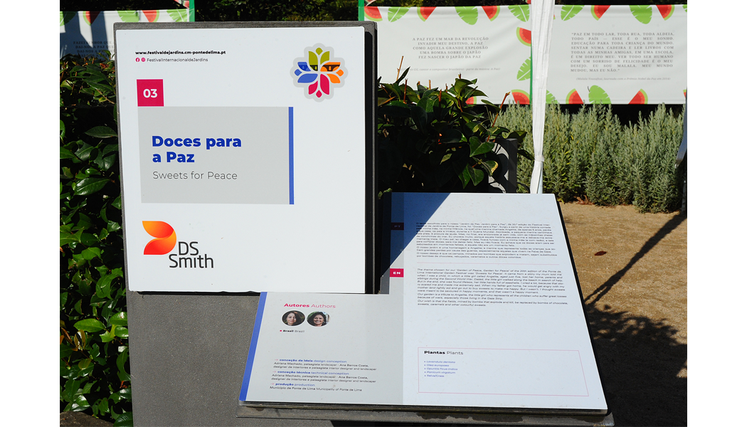 O tema escolhido para o nosso “Jardim da Paz, Jardim para a Paz”, da 20.ª edição do Festival Internacional de Jardins de Ponte de Lima, foi “Doces para a Paz”. Surgiu a partir de uma história contada pela minha mãe, na minha infância, na qual uma menina chamada Angelita, de apenas 5 anos, perdia a sua casa, os pais e irmãos, durante a II Guerra Mundial.