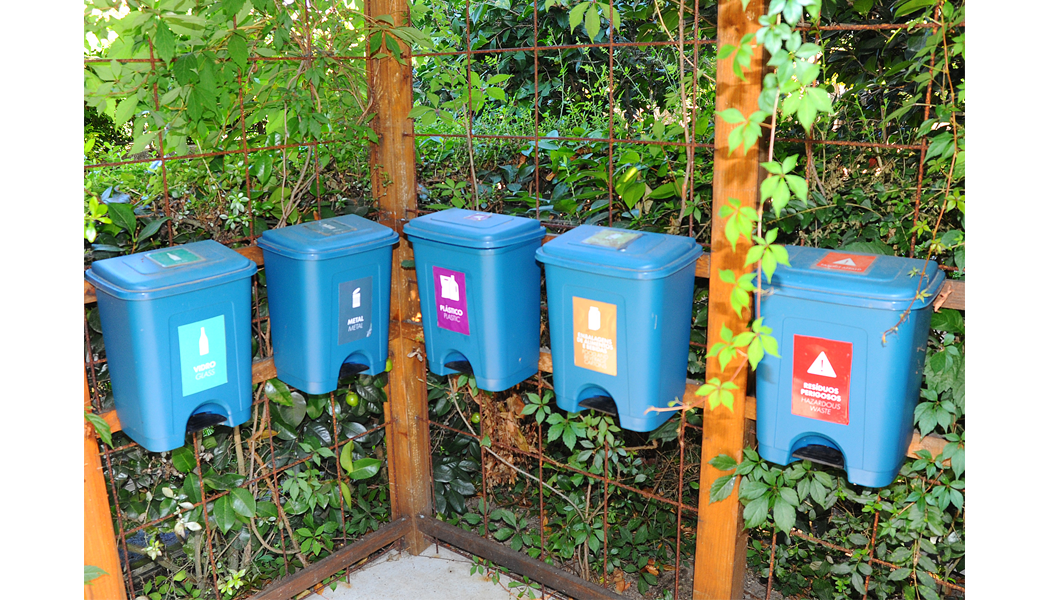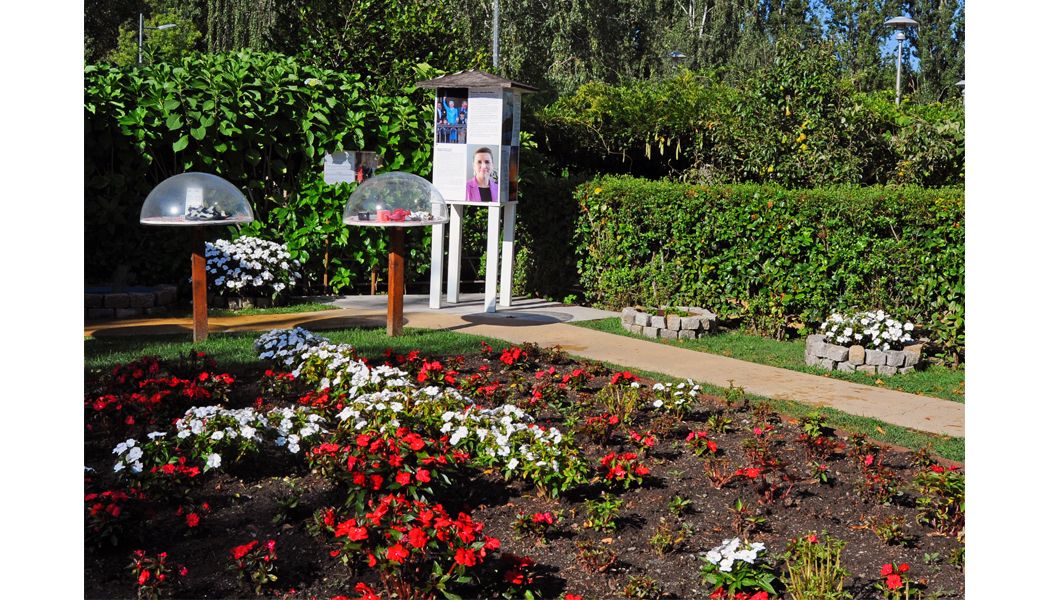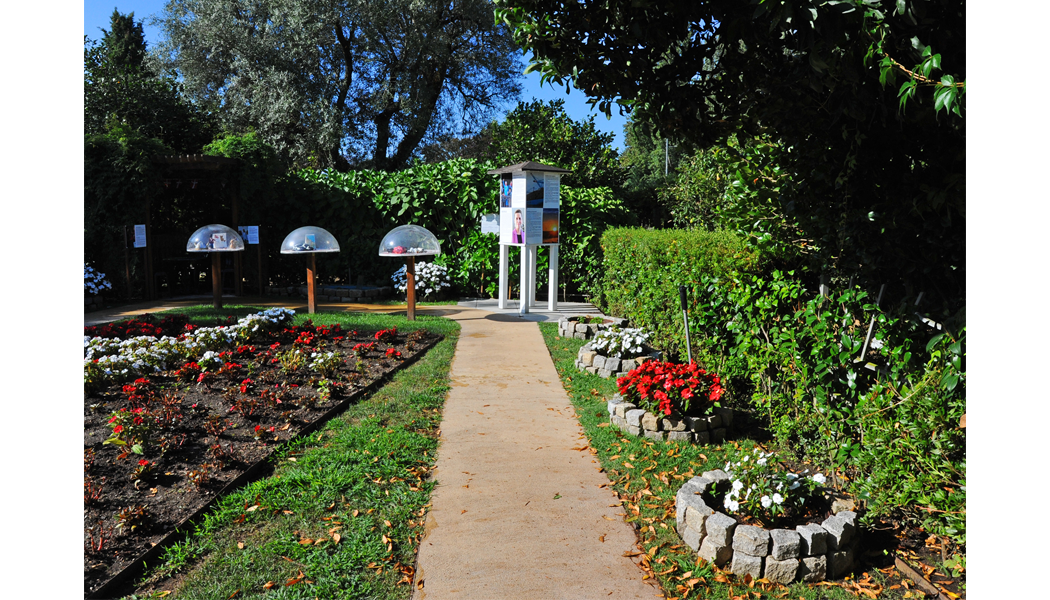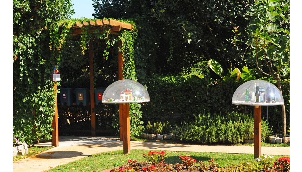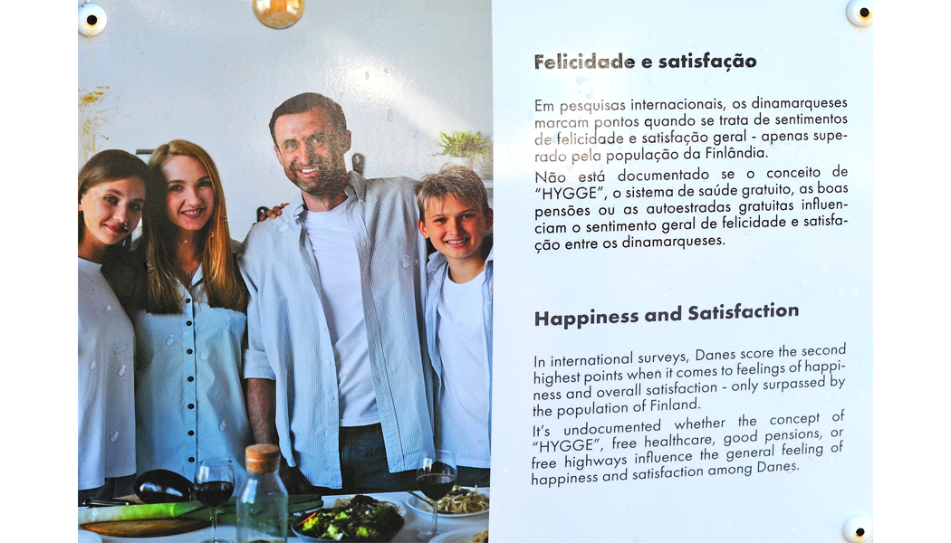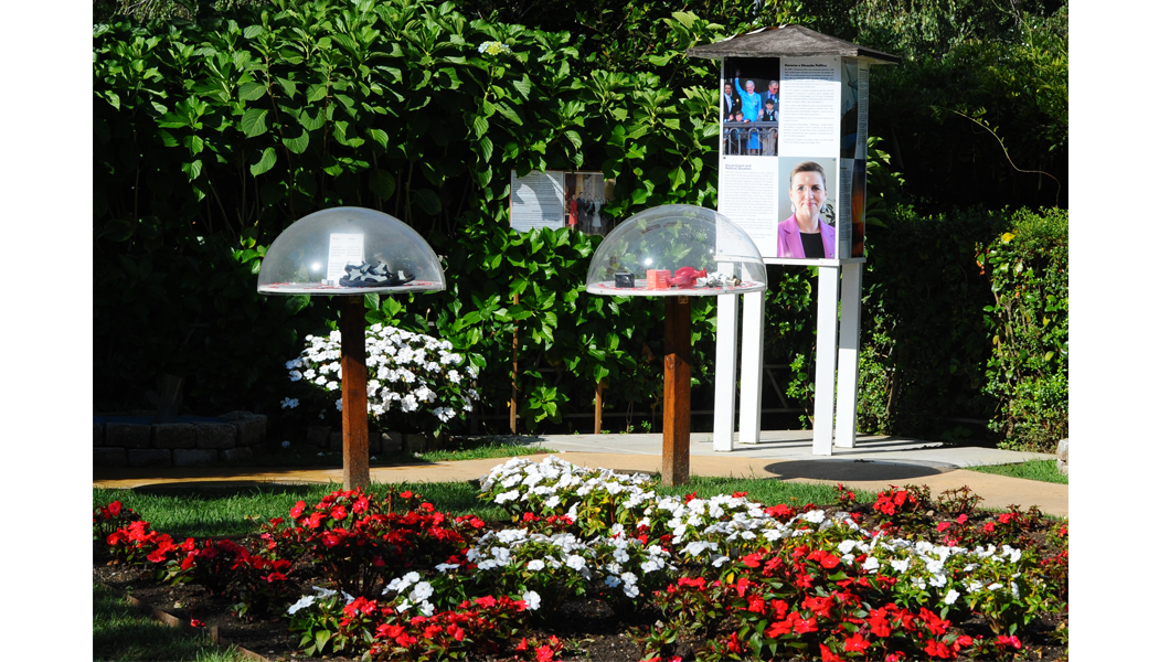 Num dos cantos do jardim há uma pérgula plantada com trepadeiras verdes, onde os visitantes têm a oportunidade de se sentar e descansar à volta de uma pequena mesa e desfrutar de paz, abrigo e sombra. No canto oposto, numa área vedada, há um stand com 10 contentores de lixo, em painéis com texto explicativo, que mostram e contam como os resíduos domésticos dos cidadãos na Dinamarca são separados em 11 grupos distintos. Num outro canto do jardim, existe um “pilar de comunicação” que, através de textos, painéis e imagens, informa os visitantes sobre a história, a geografia, a natureza e a paisagem da Dinamarca, a população, a atual “paisagem” política, o governo, o parlamento, o emprego, as empresas, as importações, os desportos, entre outros aspetos.