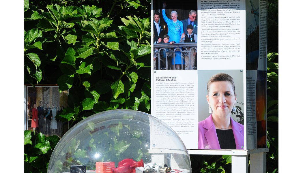 Ao longo dos dois lados do relvado, haverá também stands de exposição ao nível dos olhos, onde estarão expostos objetos e informações de/e sobre arte e produtos conhecidos de origem dinamarquesa. Haverá ainda um aquário com peixes, num ambiente aquático com plantas verdes e vasos com flores coloridas sobre relvado.